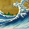 En esta impactante versión a color de la serie Cien vistas del monte Fujica. (1834), Katsushika Hokusai transforma lo cotidiano en símbolo. La silueta majestuosa del Monte Fuji asoma entre un mar vibrante, enmarcado por una oleada de espuma que evoca tanto movimiento como poesía. Las aves parecen danzar entre las curvas de la espuma, mientras el dorado del fondo eleva la escena a lo sagrado.
