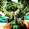 Entre el ruido de la ciudad, un árbol resiste, creciendo en medio del concreto como símbolo de fuerza y esperanza. Esta imagen urbana fusiona la crudeza de los taxis neoyorquinos y los rascacielos con la vitalidad de la naturaleza que se abre paso.