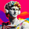 NeoApollo fusiona la perfección escultórica del arte clásico con la energía vibrante del color y la cultura moderna. La mirada serena de Apolo, dios de la luz y la creatividad, se reinterpreta aquí con audífonos y trazos multicolor que transforman su elegancia atemporal en un ícono contemporáneo.